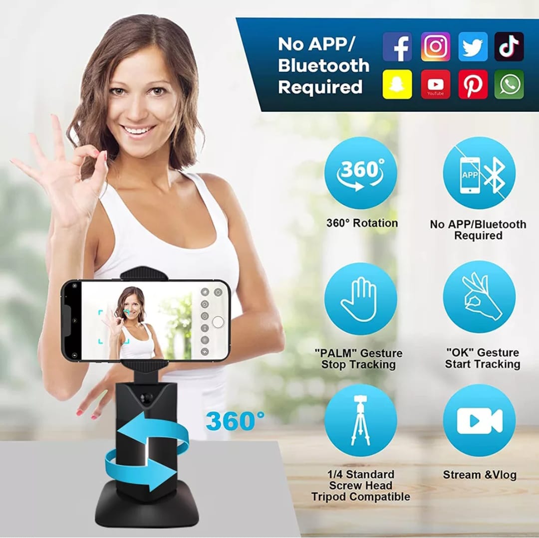 Adaptable a cualquier smarphone, No requiere aplicación, Control de gestos de inicio/pausa, Luz indicadora, X 360 grados ( izquierdo y derecho), Y 190 grados (arriba y abajo), Distancia debe ser 1 metro para rastrear, Modo de seguimiento facial automático, Soporte plegable, Capacidad de la batería 2200mHh, Resistencia 6-8 horas, Puerto de carga tipo C, Potencia 5V 1A
